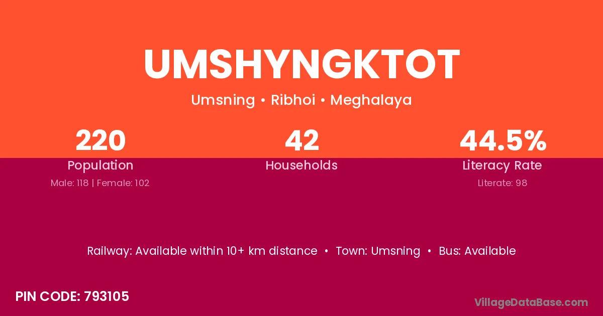 Umshyngktot village has a total population of 220 people, of which 118 are males and 102 are females.