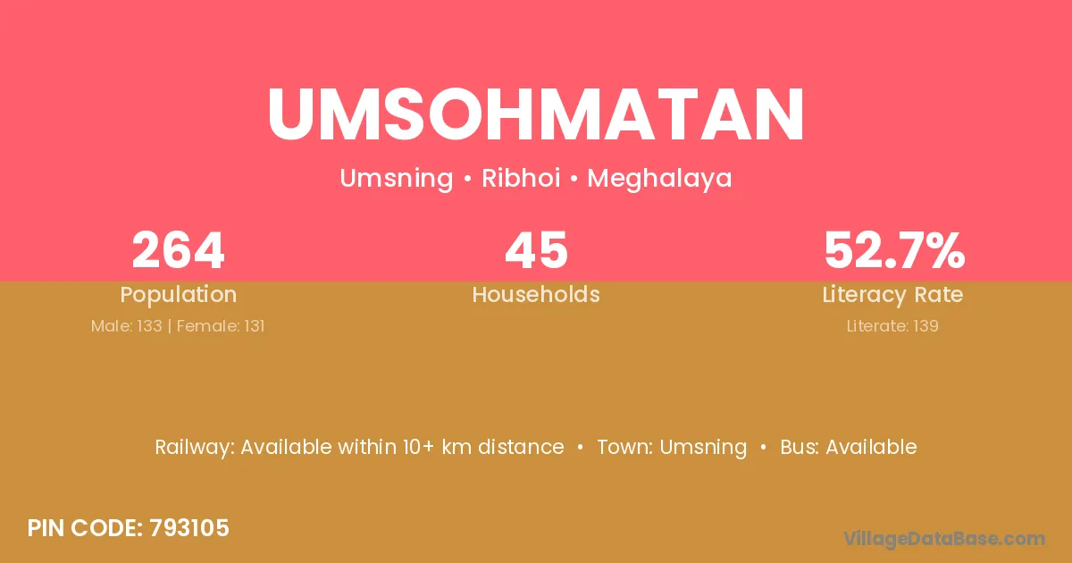 The literacy rate of Umsohmatan village is 52.65%. Male literacy stands at 43.61% and female literacy at 61.83%.