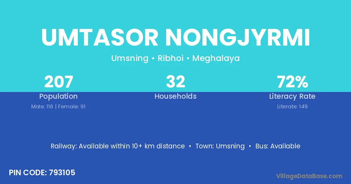 Umtasor Nongjyrmi village has a total population of 207 people, of which 116 are males and 91 are females.
