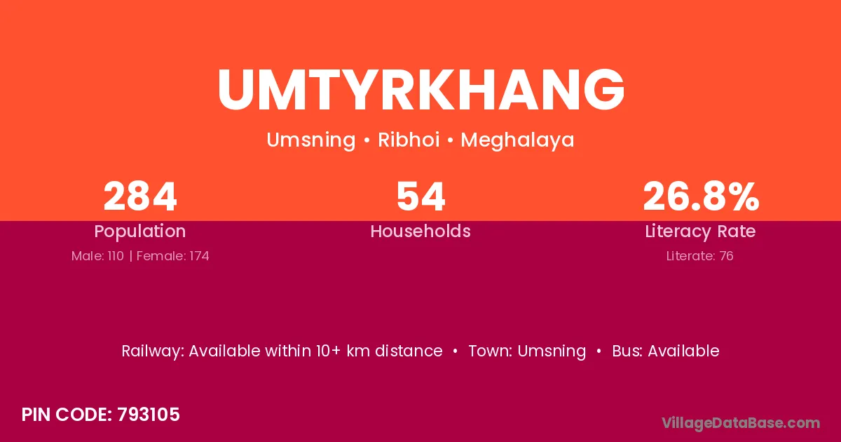 Umtyrkhang village has a total population of 284 people, of which 110 are males and 174 are females.