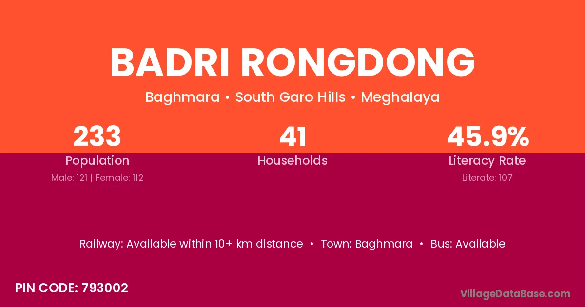 Badri Rongdong village has a total population of 233 people, of which 121 are males and 112 are females.