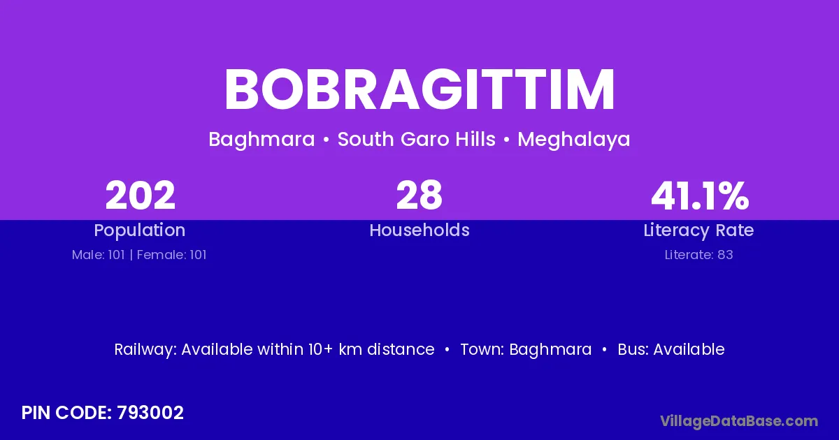 Bobragittim village has a total population of 202 people, of which 101 are males and 101 are females.