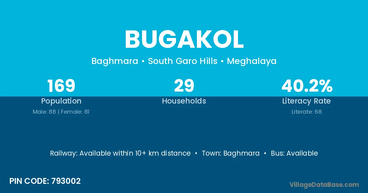 According to Census 2011 information, the village code of Bugakol village is 793002.