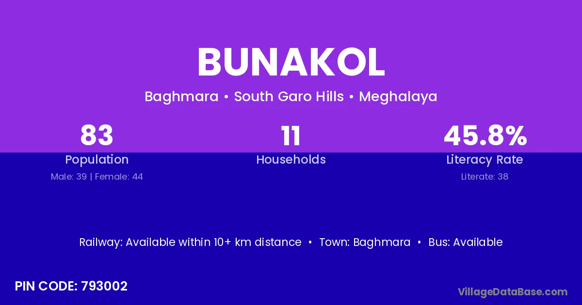 Bunakol village has a total population of 83 people, of which 39 are males and 44 are females.