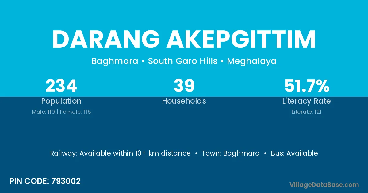 Darang Akepgittim village has a total population of 234 people, of which 119 are males and 115 are females.