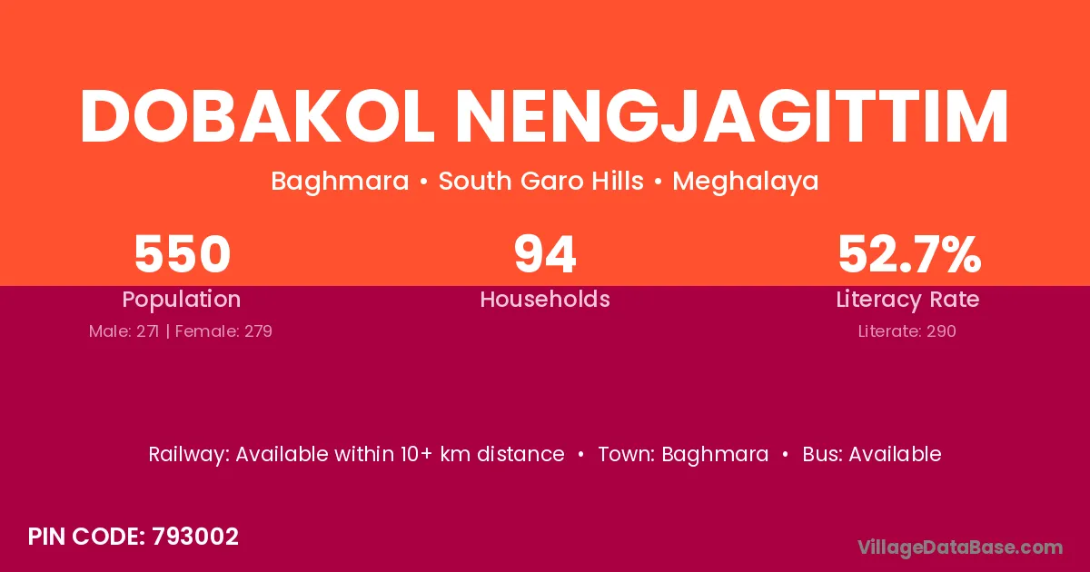 Dobakol Nengjagittim village has a total population of 550 people, of which 271 are males and 279 are females.