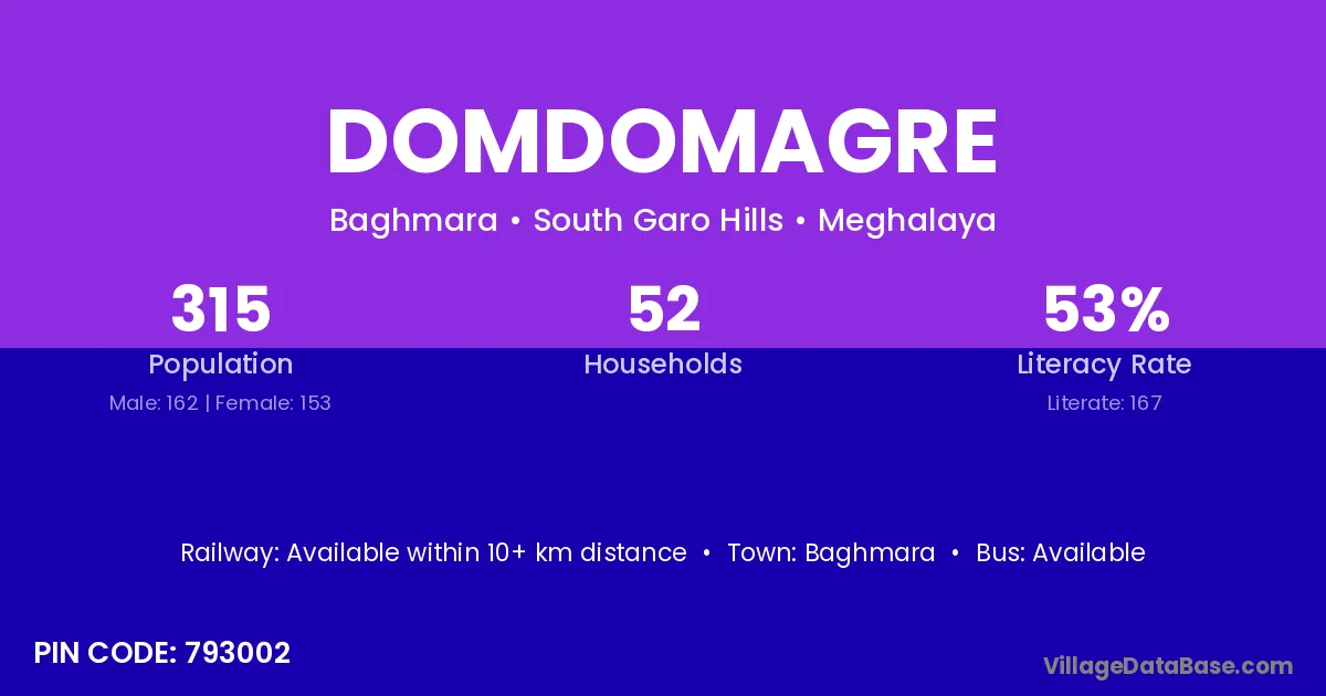 Domdomagre village has a total population of 315 people, of which 162 are males and 153 are females.