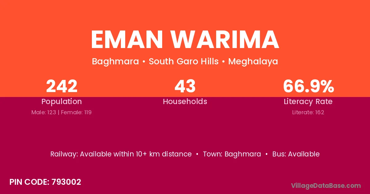 Eman Warima village has a total population of 242 people, of which 123 are males and 119 are females.