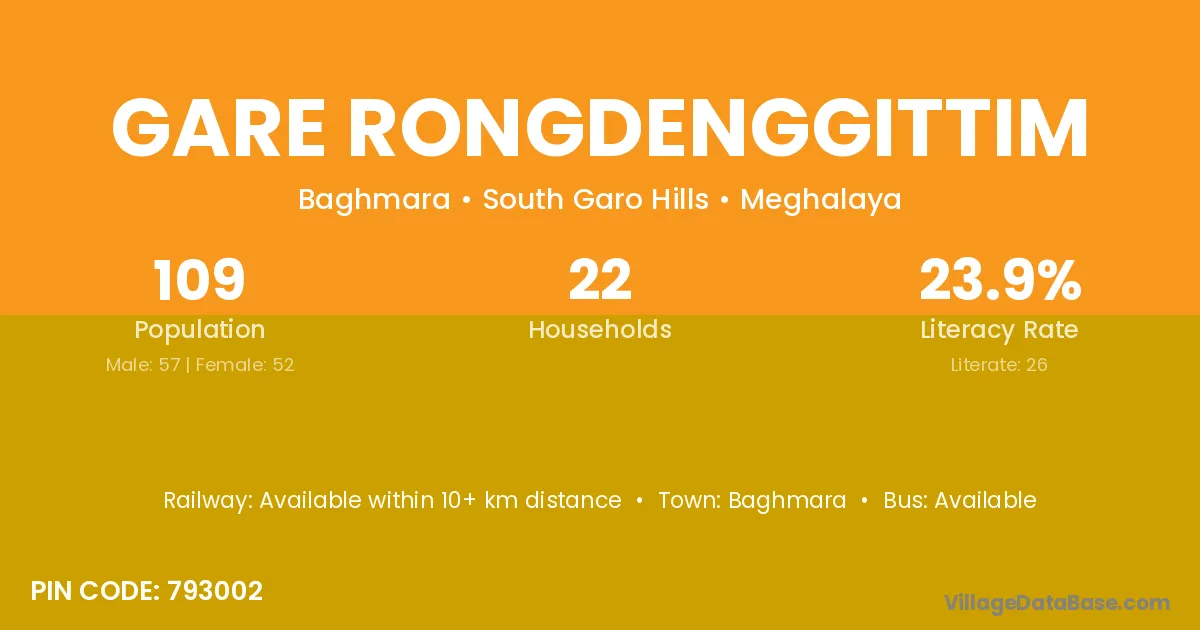 Gare Rongdenggittim village has a total population of 109 people, of which 57 are males and 52 are females.