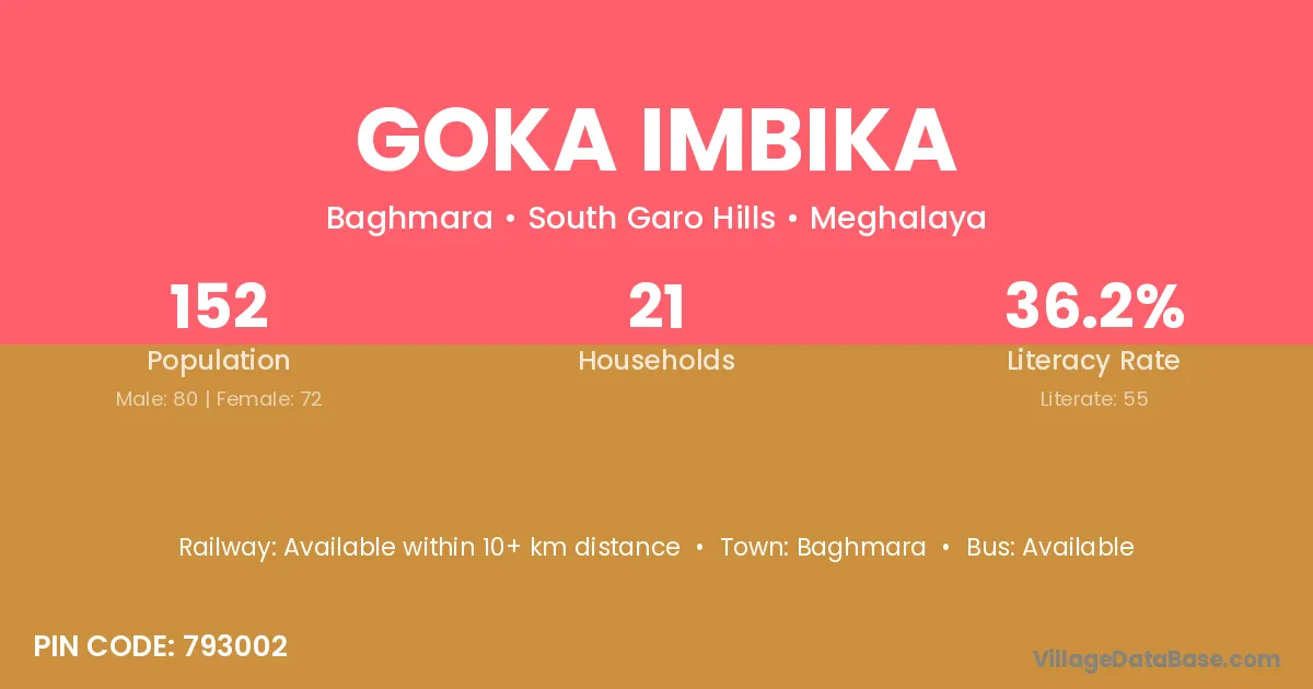 Goka Imbika village has a total population of 152 people, of which 80 are males and 72 are females.