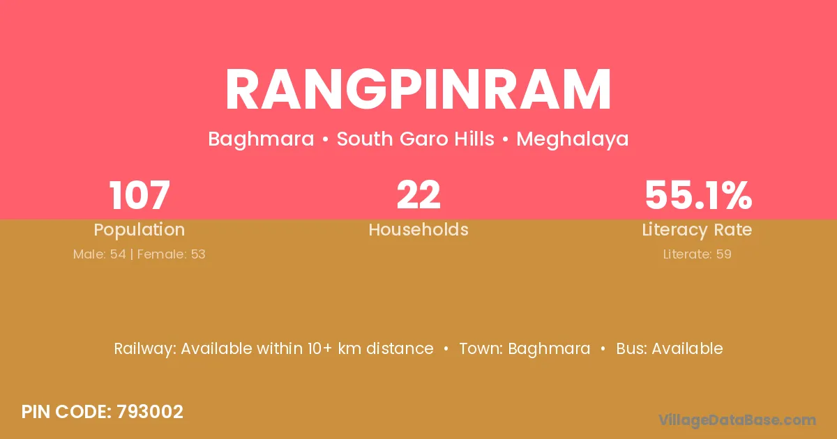 Rangpinram village has a total population of 107 people, of which 54 are males and 53 are females.