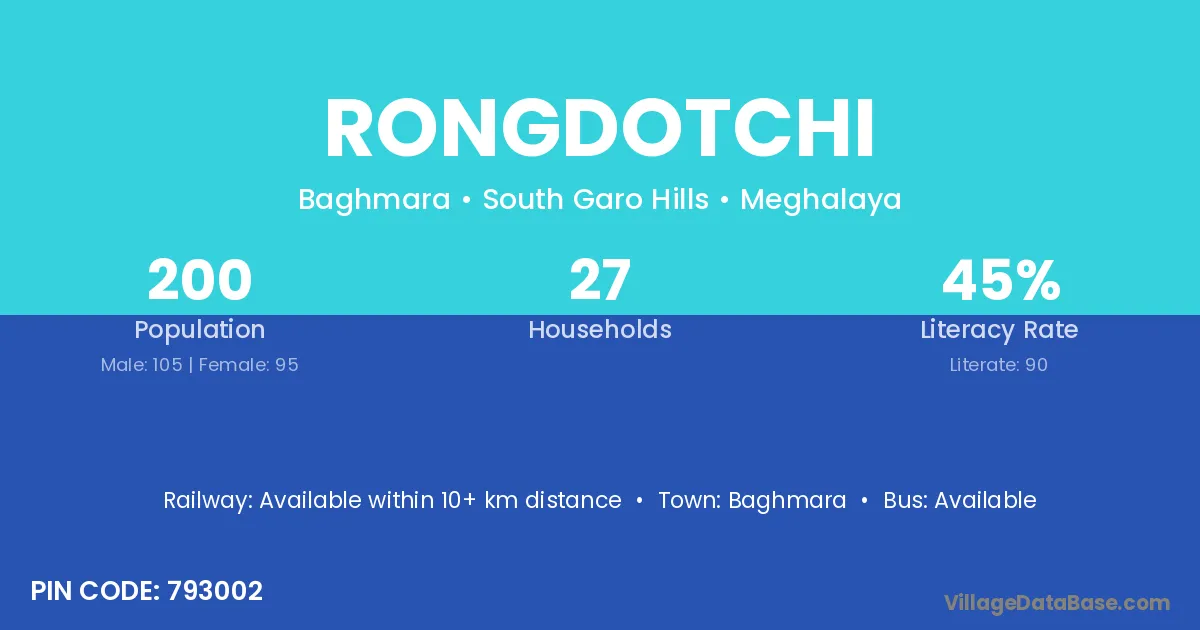 Rongdotchi village has a total population of 200 people, of which 105 are males and 95 are females.
