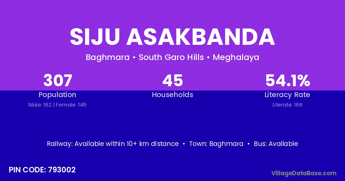 Siju Asakbanda village has a total population of 307 people, of which 162 are males and 145 are females.