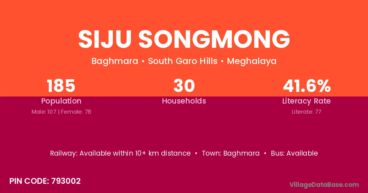 Siju Songmong village has a total population of 185 people, of which 107 are males and 78 are females.