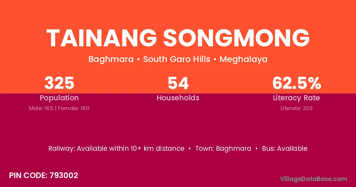 Tainang Songmong village has a total population of 325 people, of which 165 are males and 160 are females.