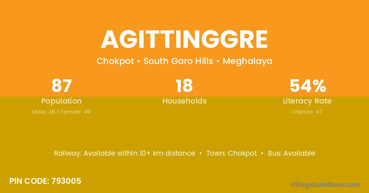 Agittinggre village has a total population of 87 people, of which 38 are males and 49 are females.