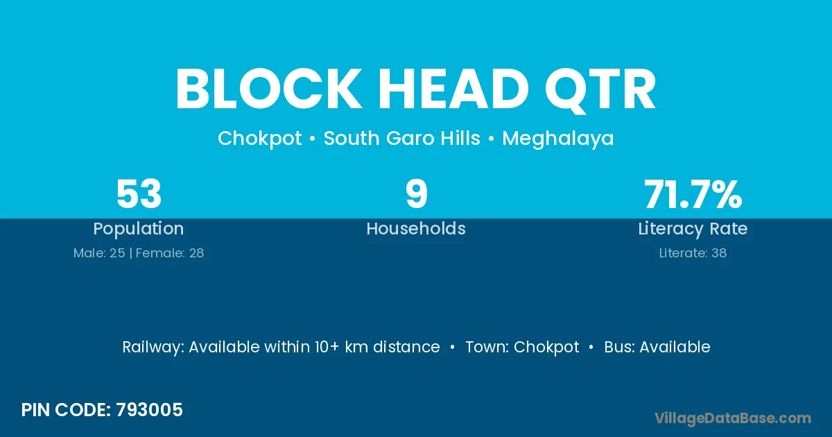 According to Census 2011 information, the village code of Block Head Qtr village is 793005.