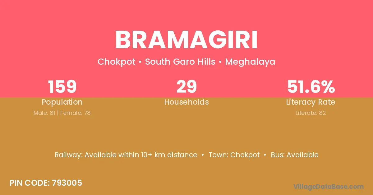 Bramagiri village has a total population of 159 people, of which 81 are males and 78 are females.