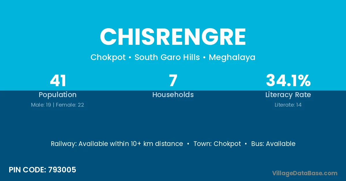 Chisrengre village has a total population of 41 people, of which 19 are males and 22 are females.