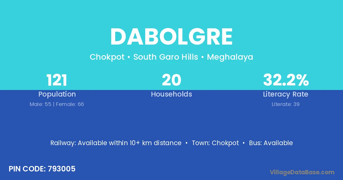 Dabolgre village has a total population of 121 people, of which 55 are males and 66 are females.