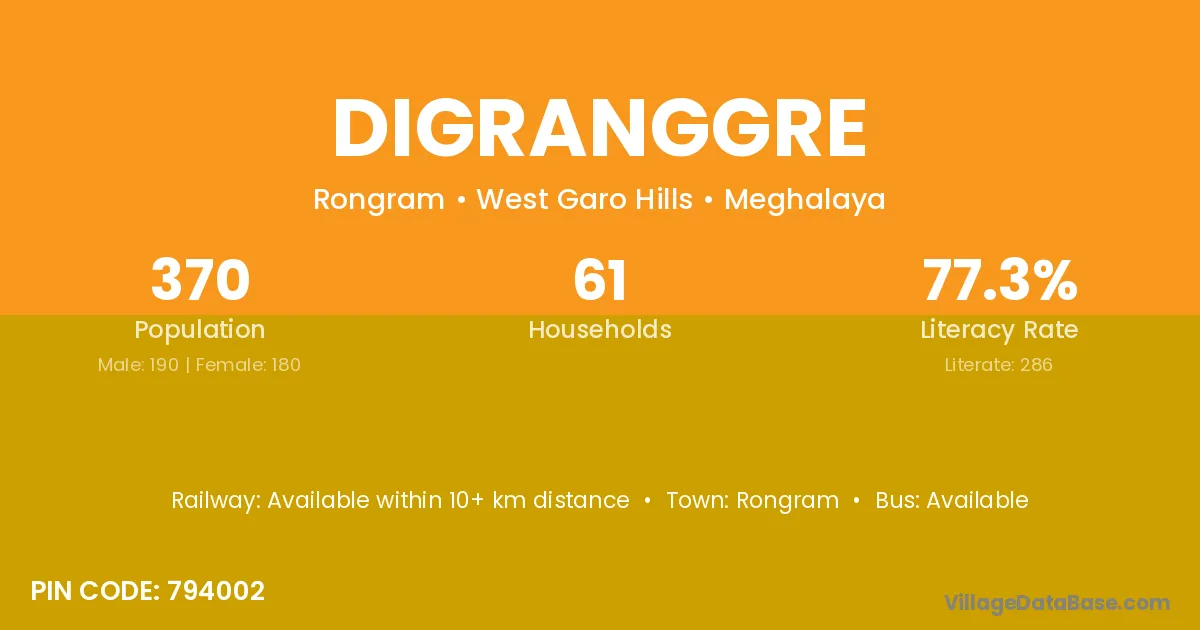The literacy rate of Digranggre village is 44.54%. Male literacy stands at 45.31% and female literacy at 43.64%.