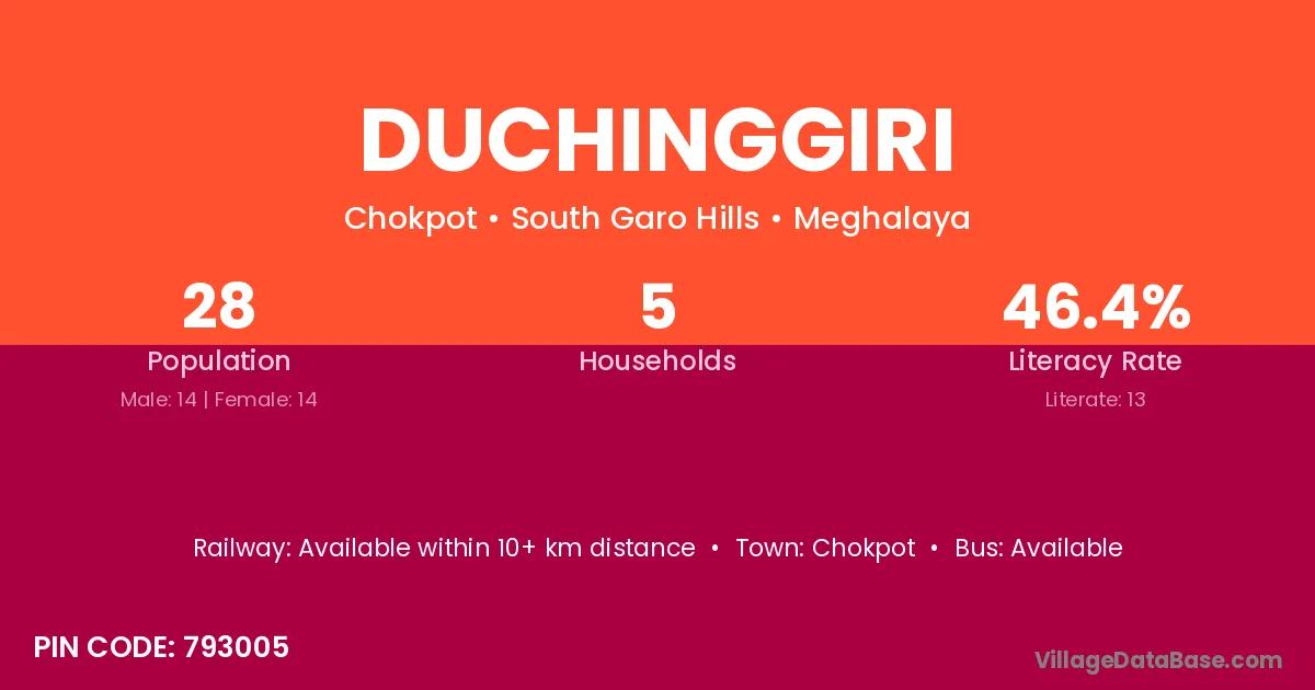 Duchinggiri village has a total population of 28 people, of which 14 are males and 14 are females.