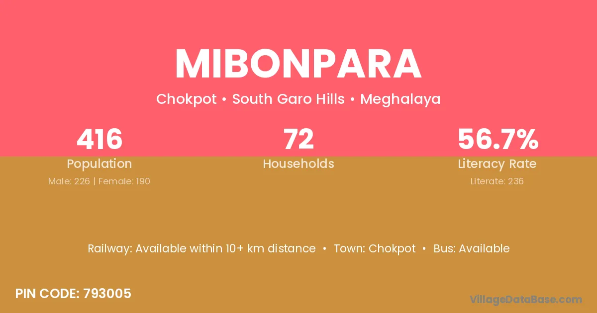 Mibonpara village has a total population of 416 people, of which 226 are males and 190 are females.