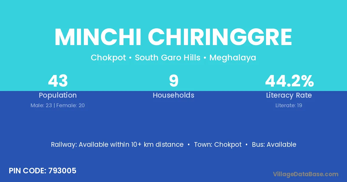 Minchi Chiringgre village has a total population of 43 people, of which 23 are males and 20 are females.