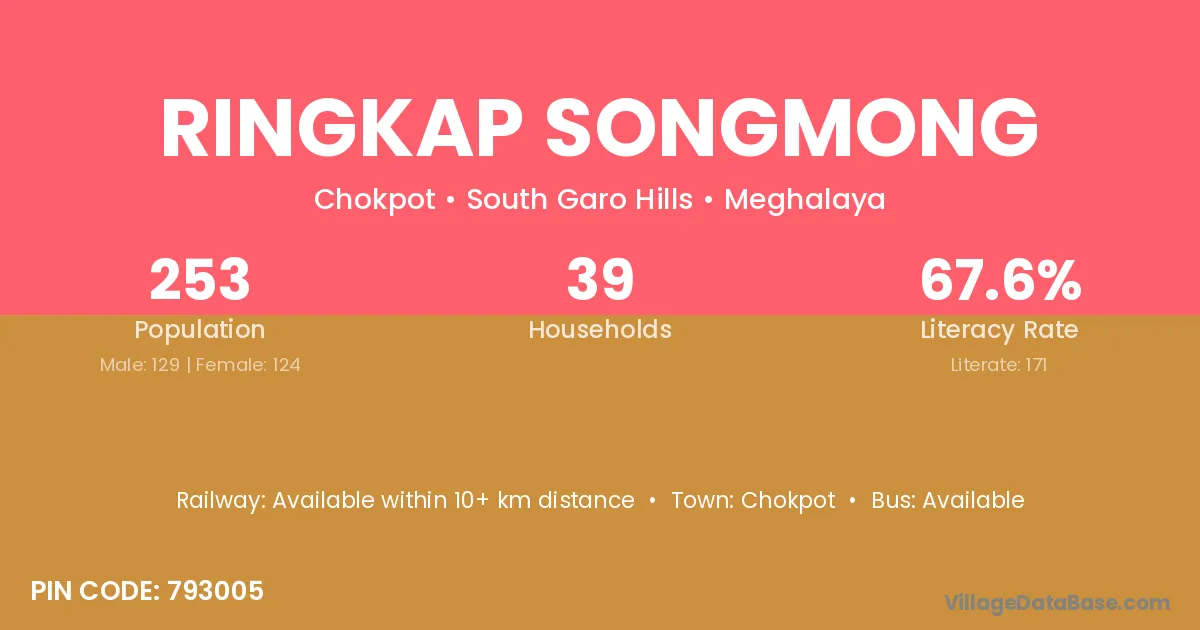 Ringkap Songmong village has a total population of 253 people, of which 129 are males and 124 are females.