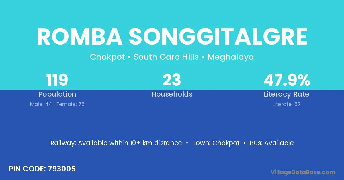 Romba Songgitalgre village has a total population of 119 people, of which 44 are males and 75 are females.