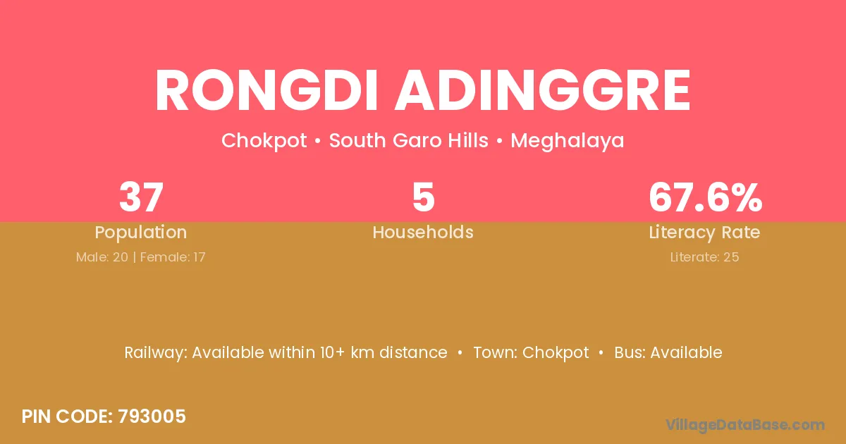 Rongdi Adinggre village has a total population of 37 people, of which 20 are males and 17 are females.