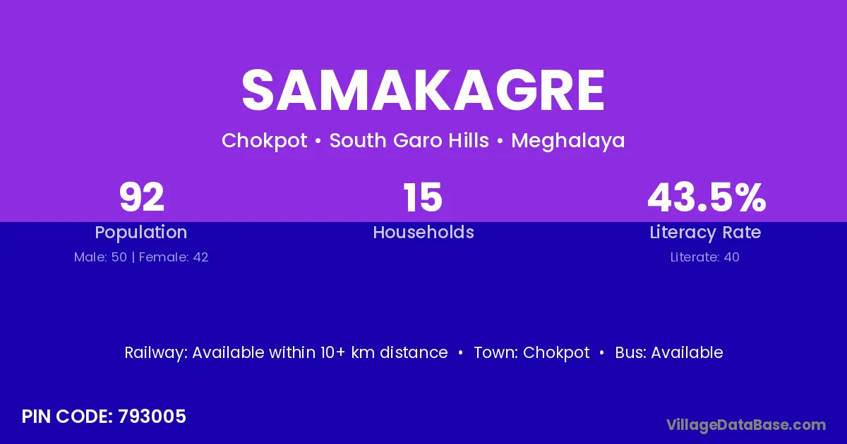 According to Census 2011 information, the village code of Samakagre village is 793005.