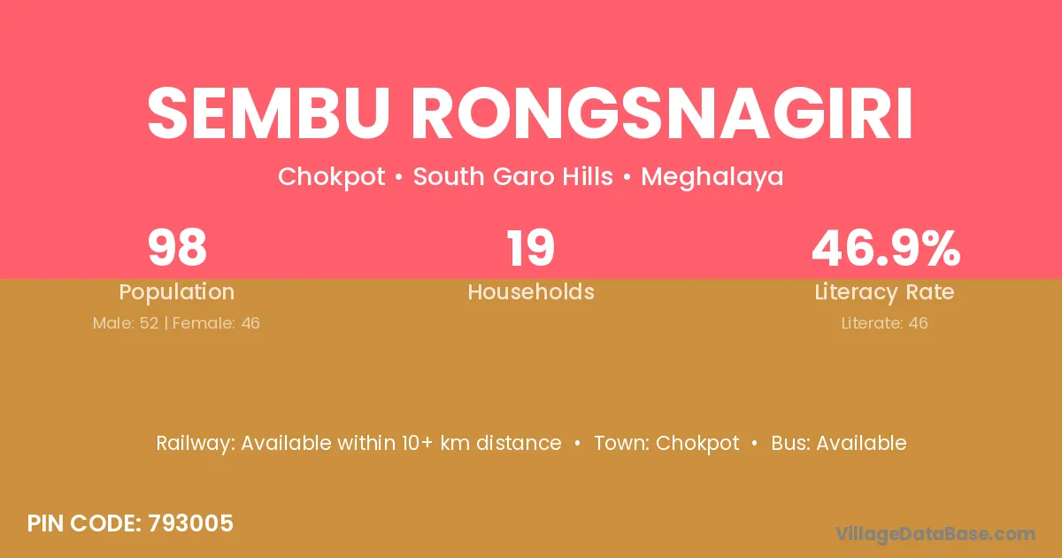 Sembu Rongsnagiri village has a total population of 98 people, of which 52 are males and 46 are females.