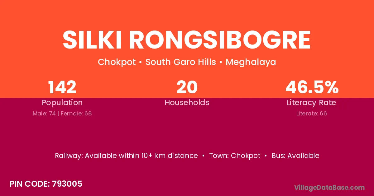 Silki Rongsibogre village has a total population of 142 people, of which 74 are males and 68 are females.