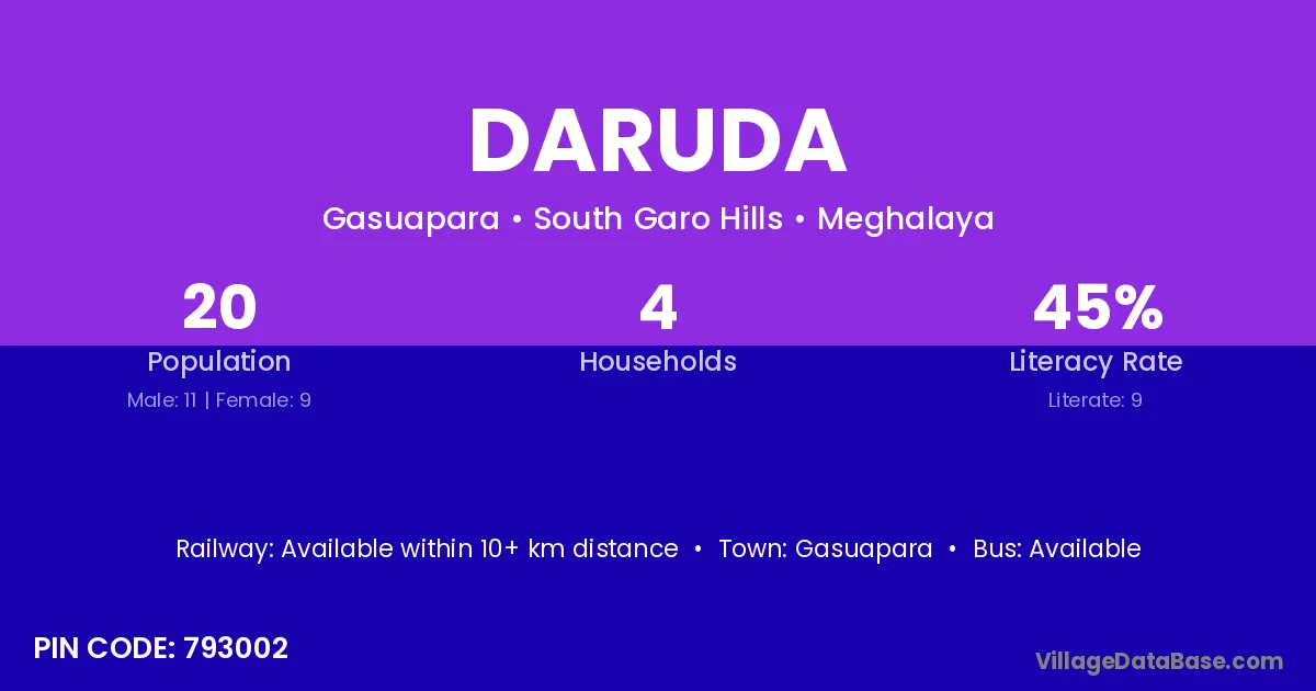 According to Census 2011 information, the village code of Daruda village is 793002.