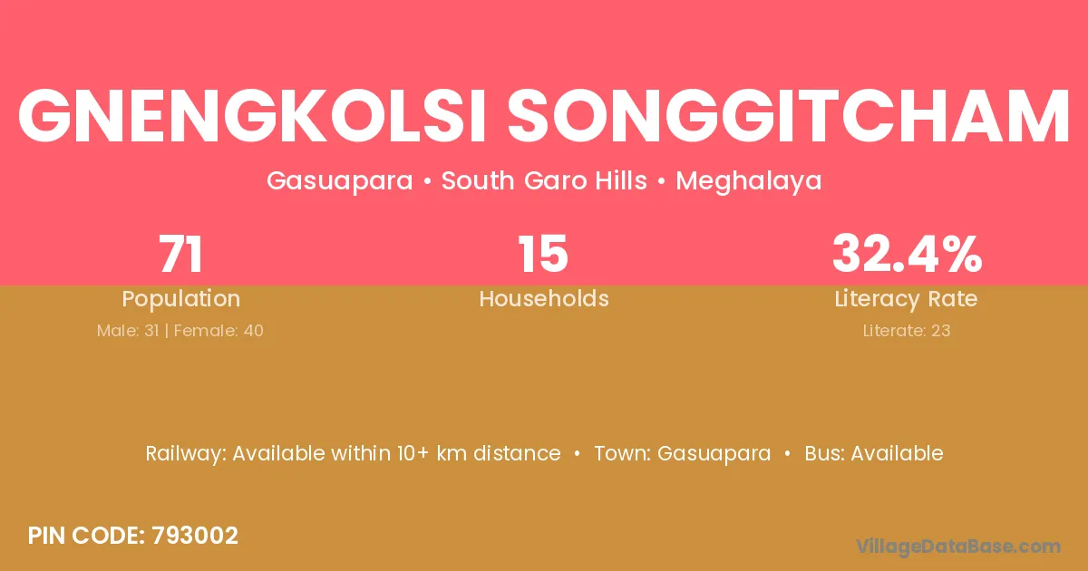 Gnengkolsi Songgitcham village has a total population of 71 people, of which 31 are males and 40 are females.