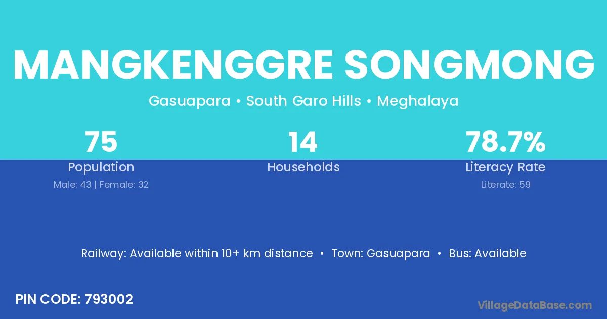 Mangkenggre Songmong village has a total population of 75 people, of which 43 are males and 32 are females.