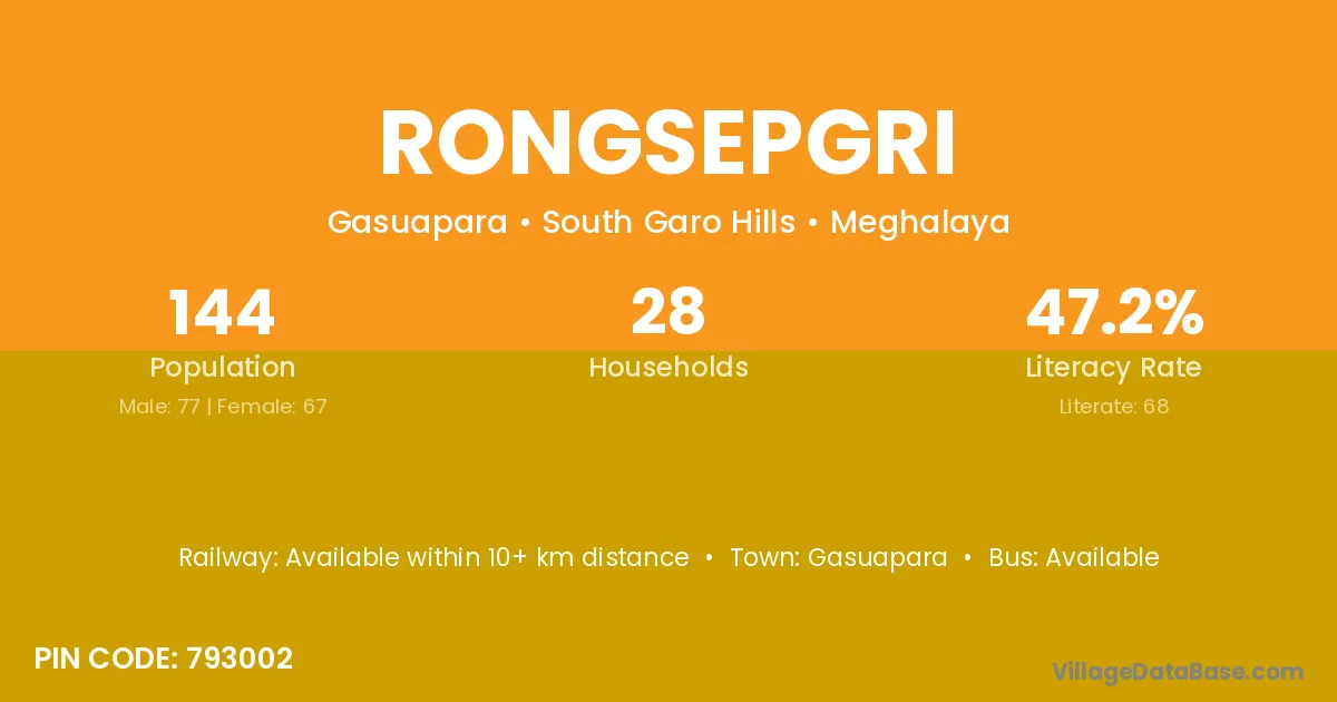Rongsepgri village has a total population of 144 people, of which 77 are males and 67 are females.