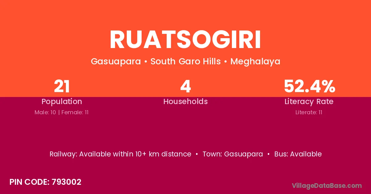 Ruatsogiri village has a total population of 21 people, of which 10 are males and 11 are females.