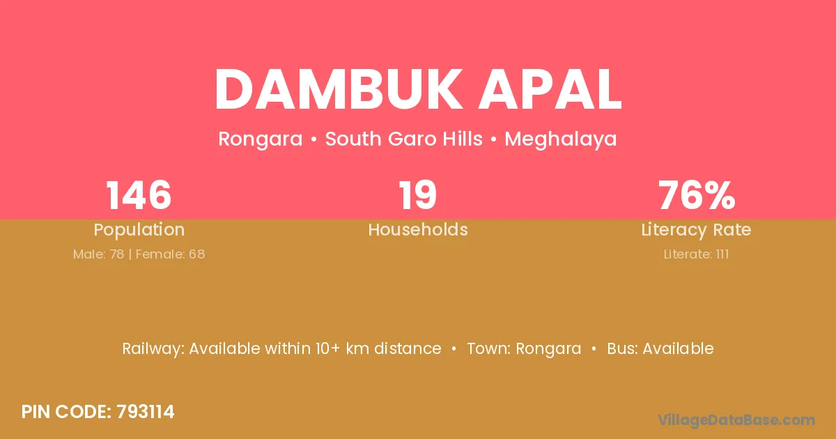 Dambuk Apal village has a total population of 146 people, of which 78 are males and 68 are females.