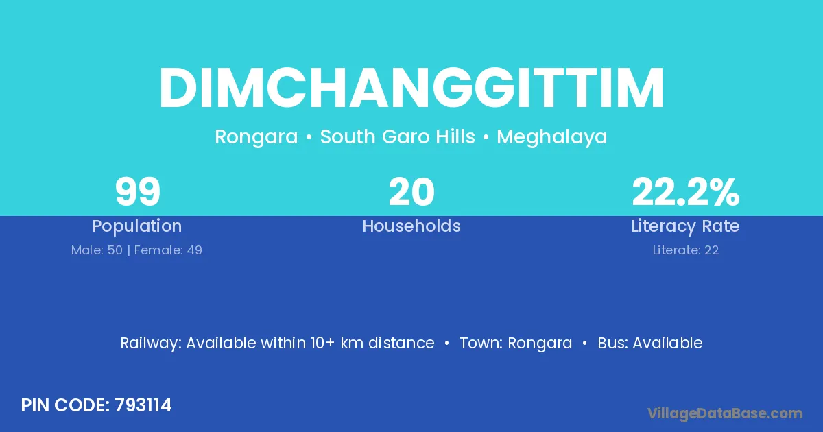 Dimchanggittim village has a total population of 99 people, of which 50 are males and 49 are females.