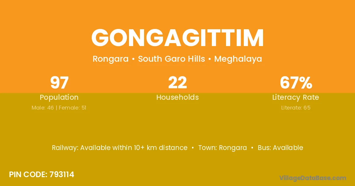 Gongagittim village has a total population of 97 people, of which 46 are males and 51 are females.