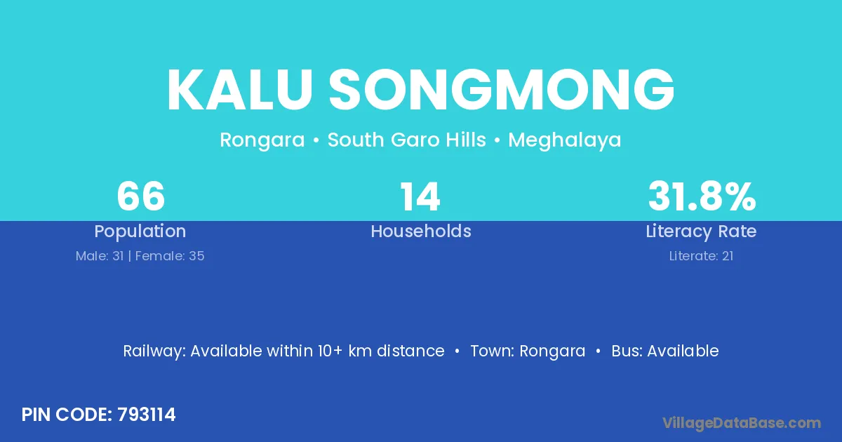 Kalu Songmong village has a total population of 66 people, of which 31 are males and 35 are females.
