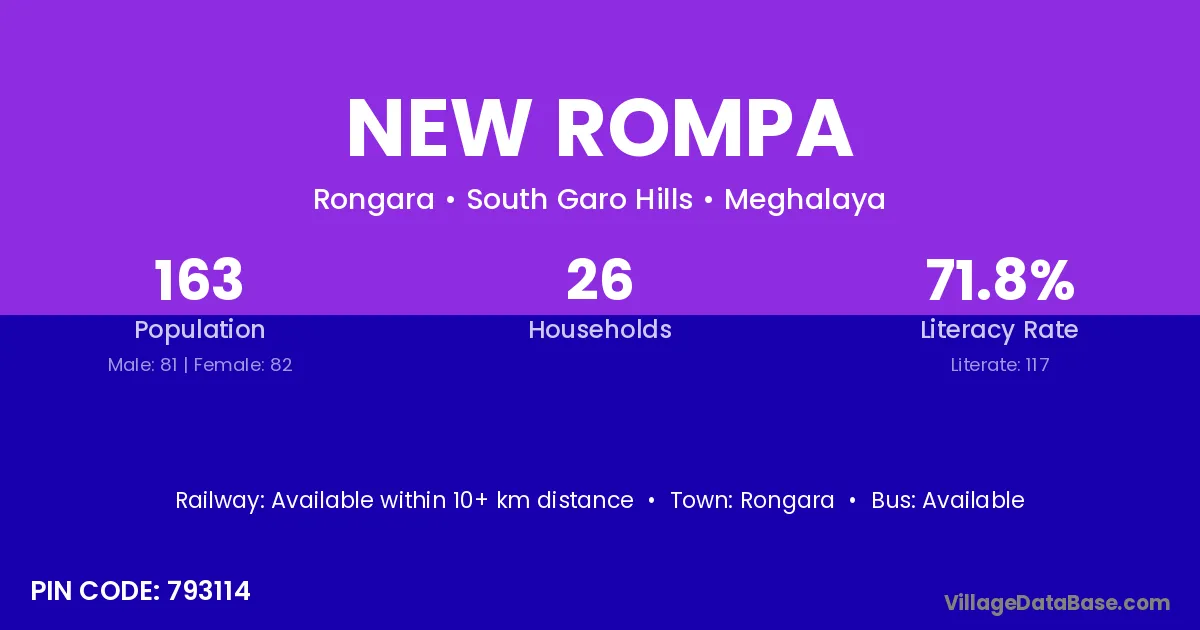 New Rompa village has a total population of 163 people, of which 81 are males and 82 are females.