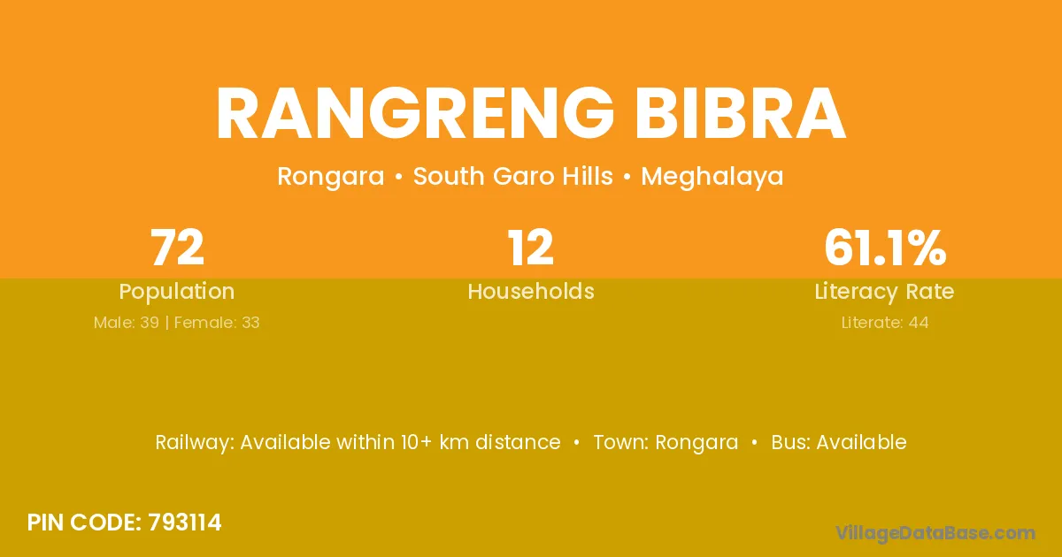 Rangreng Bibra village has a total population of 72 people, of which 39 are males and 33 are females.