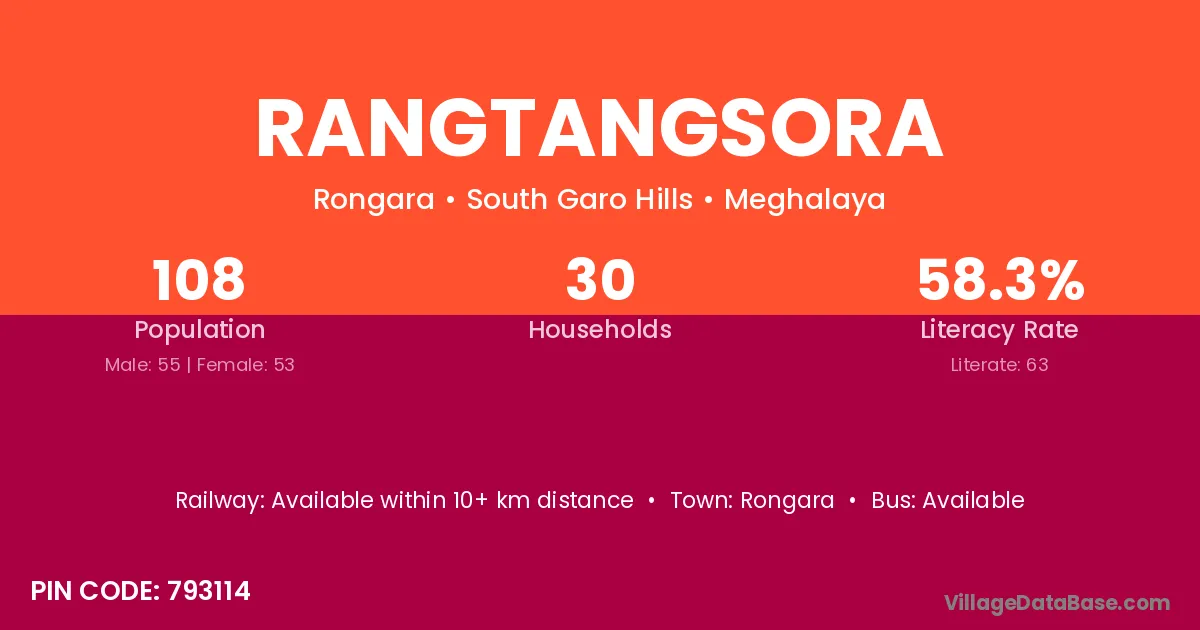 Rangtangsora village has a total population of 108 people, of which 55 are males and 53 are females.