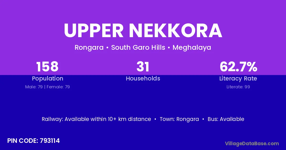 Upper Nekkora village has a total population of 158 people, of which 79 are males and 79 are females.