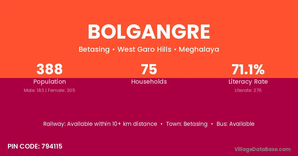Bolgangre village has a total population of 388 people, of which 183 are males and 205 are females.