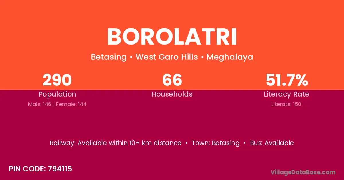 Borolatri village has a total population of 290 people, of which 146 are males and 144 are females.