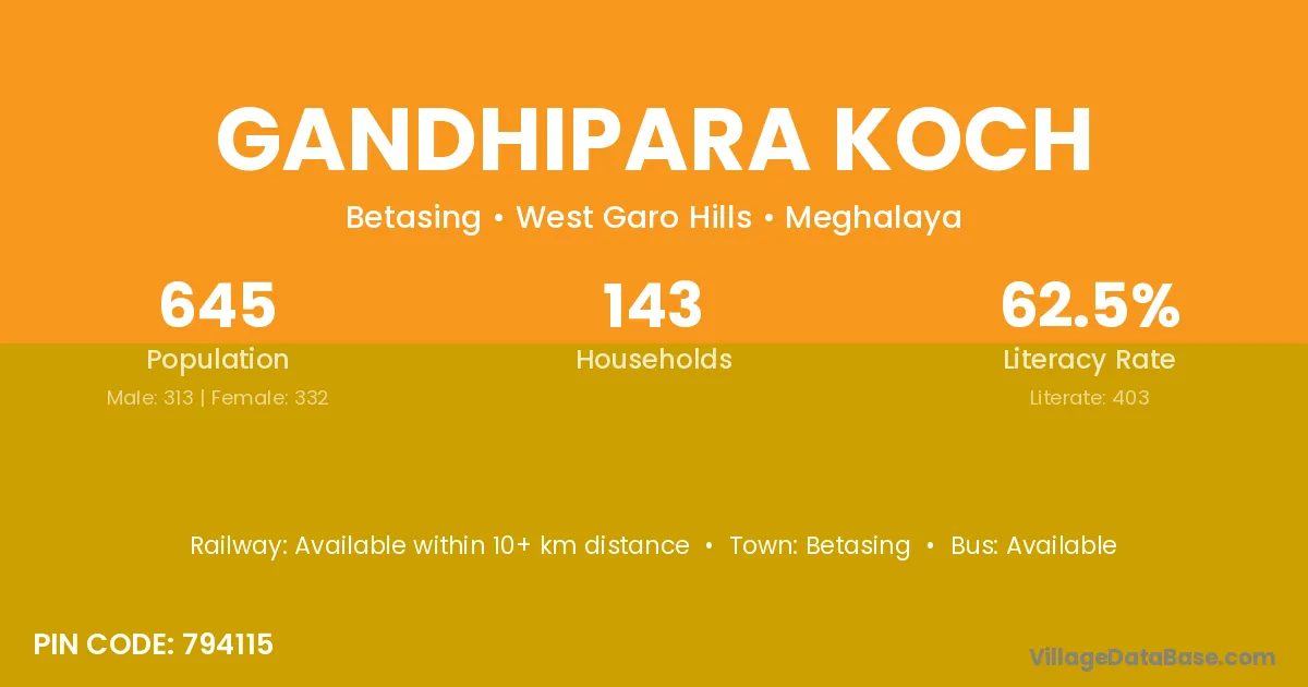 Gandhipara Koch village has a total population of 645 people, of which 313 are males and 332 are females.